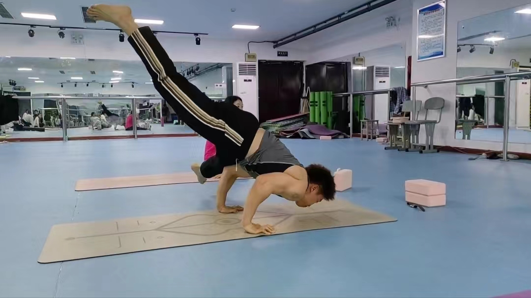 此外,还有一名男学员正在展示一个高难度的瑜伽动作。他倒立起来,身体弯曲成弓形,双脚抬高到空中,展现出惊人的力量。