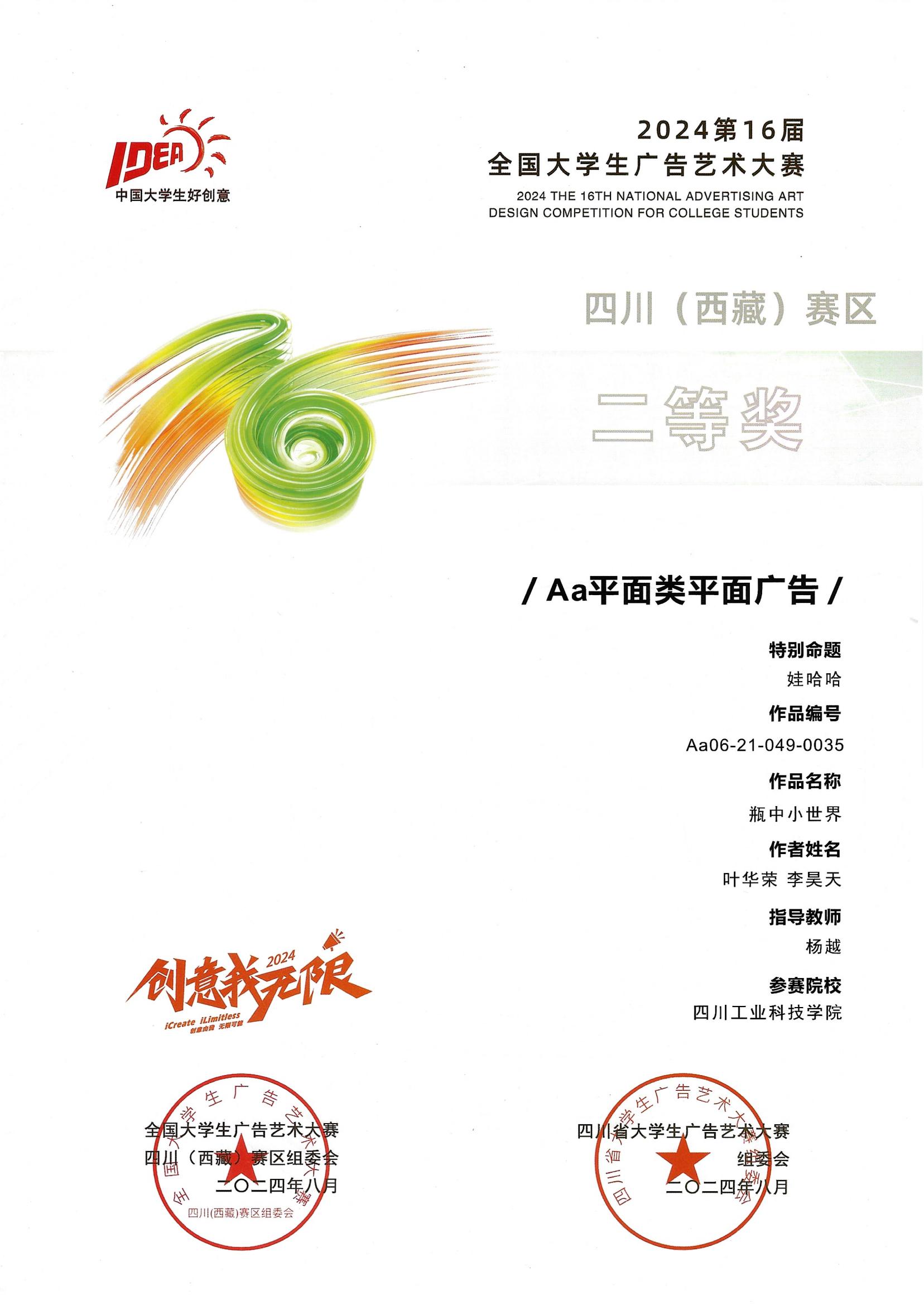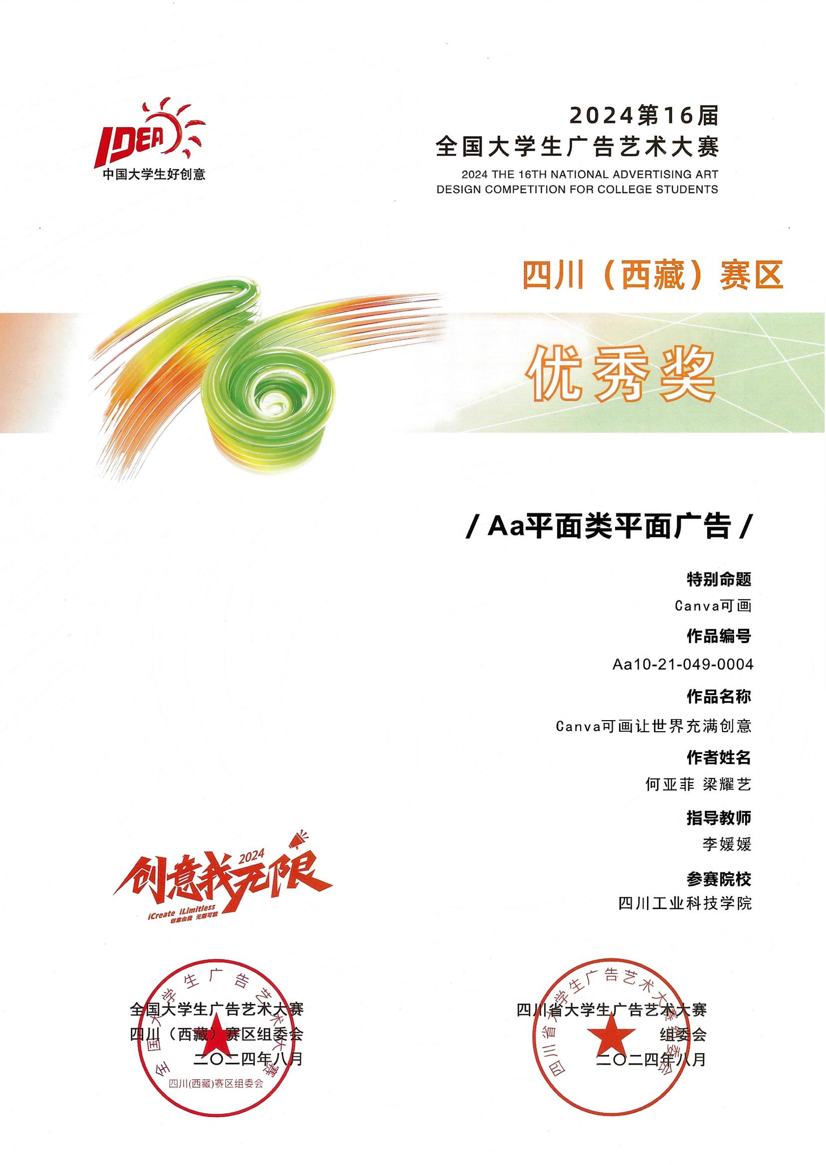 近日,第16届全国大学生广告艺术大赛四川(西藏)赛区暨第10届四川省大学生广告艺术大赛评审结果公布,学院学子荣获省级二等奖1项、优秀奖1项。
