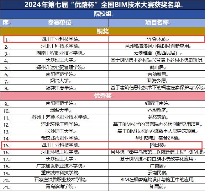 近日,由工业和信息化部人才交流中心主办的2024年第七届“优路杯”全国BIM技术大赛获奖名单出炉,学院参赛项目“竹隐·木韵”与“向日葵”分别获得院校组铜奖和优秀奖。