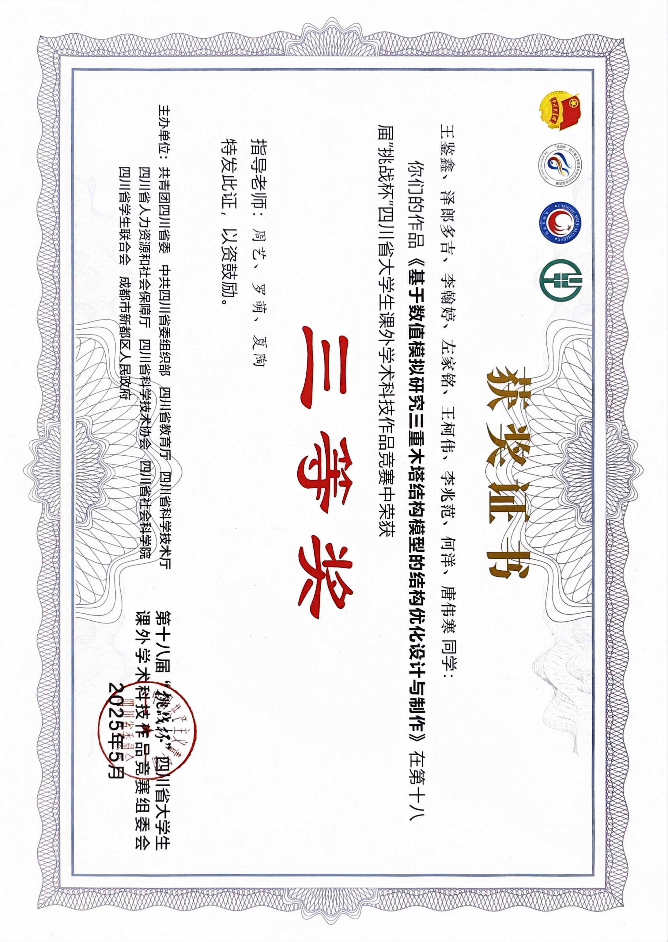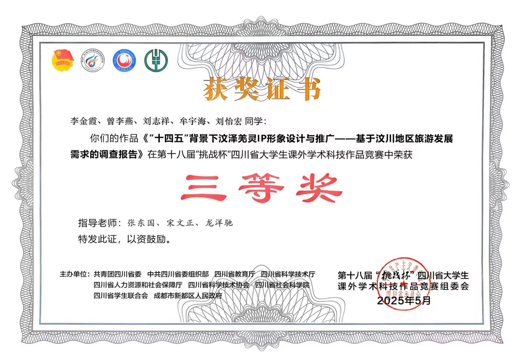 近日,第十八届“挑战杯”四川省大学生课外学术科技作品竞赛终审结果揭晓,学院2支参赛学生团队凭借扎实的课外学术科研能力斩获三等奖2项。