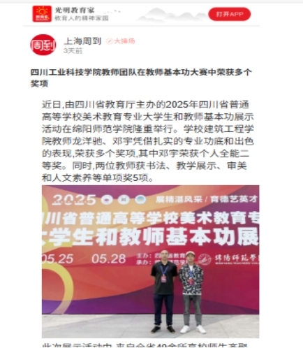 5月25日至28日,由四川省教育厅主办的2025年四川省普通高等学校美术教育专业大学生和教师基本功展示活动在绵阳师范学院举行。学校建筑工程学院教师龙洋驰、邓宇在比赛中表现优异,其中邓宇荣获个人全能二等奖,两位教师共获得书法、教学展示、审美和人文素养等5个单项奖。