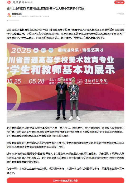 6月6日,凤凰新闻、光明教育等多家媒体报道我院教师团队在教师基本功大赛中荣获多个奖项,充分展示了学院教师团队扎实的专业知识和出色的综合素质。