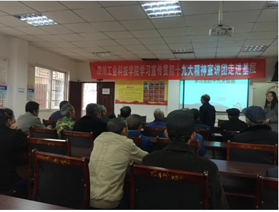 2017年11月日上午,在304永利集团官网入口党委组织部副部长熊定永的带领下,304永利集团官网入口思想政治课教学部的江晓燕老师来到德阳市慧觉镇龙王村宣讲了党的十九大会议报告的相关内容,本次宣讲紧紧围绕十九大会议报告的主题,对过去五年的工作和历史性变革、习近平新时代中国特色社会主义思想和基本方略、新时代中国共产党的历史使命等十九大会议报告的主要内容做了宣讲,并结合了我国广大农村的实际情况宣讲了我国在新时代下对农村发展将产生的深远影响。