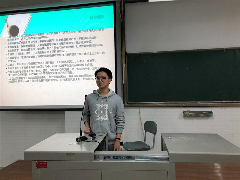 为增强大学生卫生意识,促进寝室的和谐和睦,彰显寝室的文明。10月13日晚,18级财管5班以“寝室文明”为主题的班会在毓秀楼301教室开展,参加此次主题班会的是辅导员刘羚,以及18级财管4、5、6、班和金融1班全体同学。