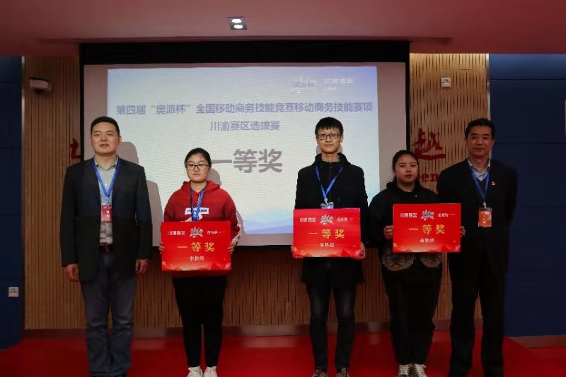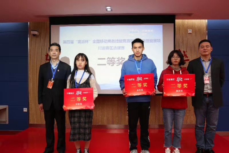 近日,由全国电子商务职业教育教学指导委员会主办的第四届“奥派杯”全国移动商务技能竞赛移动商务技能赛项四川/重庆赛区选拔赛在成都职业技术学院举行。经过前期学院组织的校内培训选拔,本次比赛我院共选派6名学生组建2支参赛队伍,分别由熊清明、张东国、伍晓龙、邓杰四位老师担任指导老师,经过近一个月的辛勤培训,由崔书磊、李成、方雪琴三名同学组成的“工科堡垒”队获得本科组一等奖,由王嘉辉、蹇玉超、魏灿林三名同学组成的“工科扬基”队获得本科组二等奖,带队参赛的四位指导老师分别获得“优秀指导教师”称号,学校在此次比赛中获“优秀组织单位奖”。