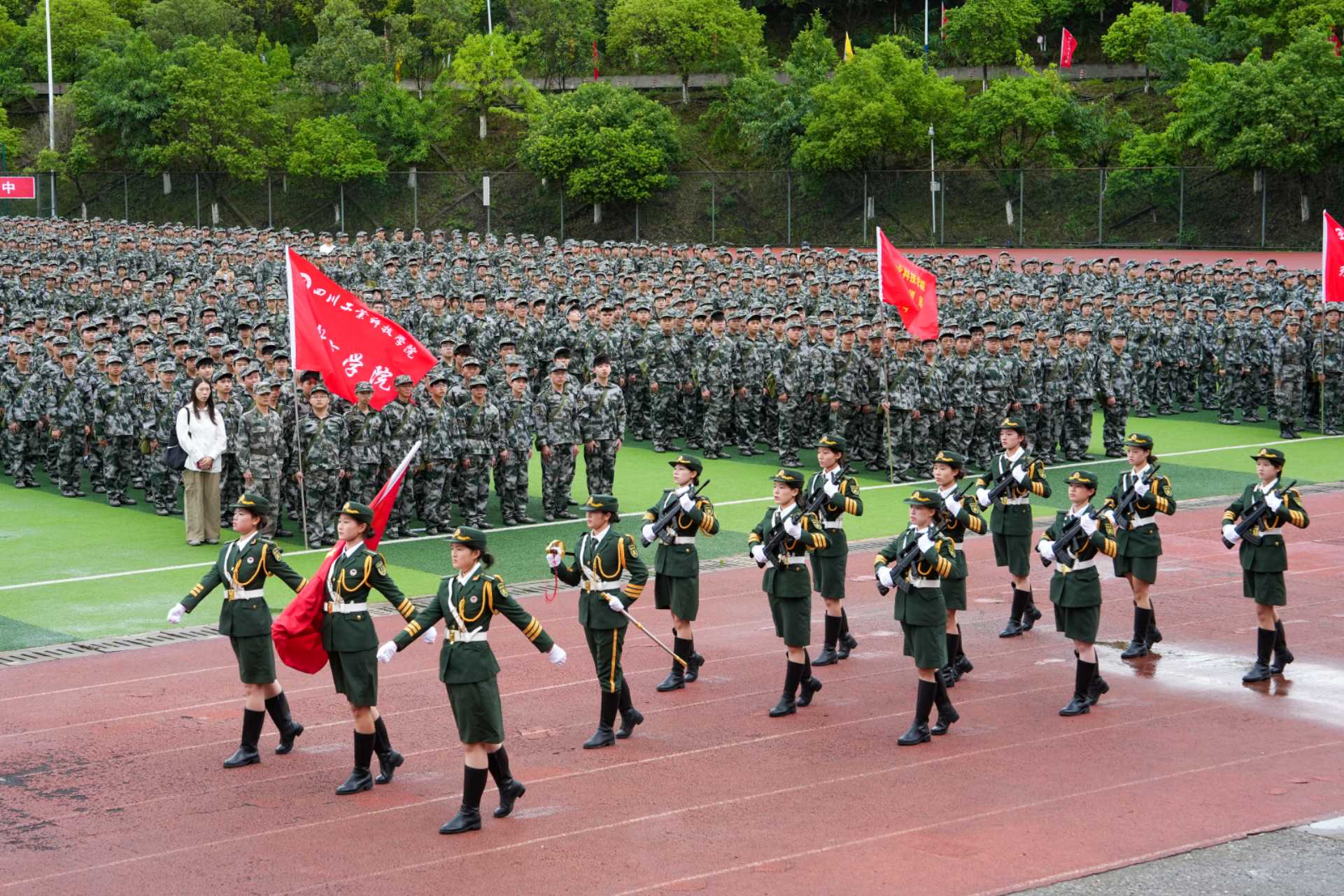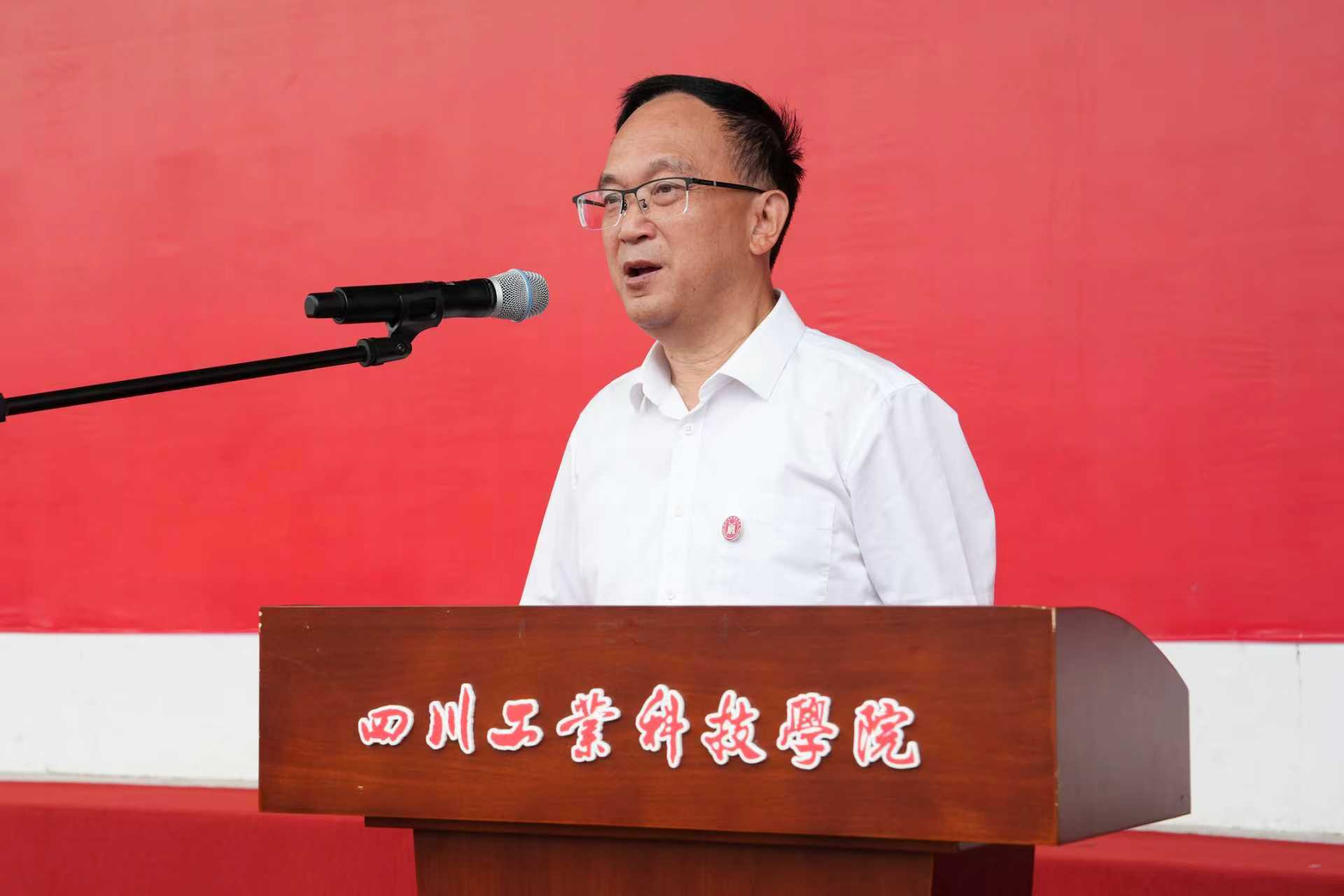 随后,学校执行校长张仁志致辞。他指出,大学生军训是全面贯彻党的教育方针、落实《中华人民共和国国防教育法》的必修课程,是强化国防观念、锤炼意志、培养集体精神的关键课程,也是同学们锤炼品格、塑造自我的“第一课”。为圆满完成本次军训任务,他对全体参训同学和教师提出四点要求。一是端正态度,全心投入。希望大家克服畏难情绪,以饱满的热情和高昂的斗志积极参训,在训练中锤炼体魄、磨练意志,夯实成长根基;二是严守纪律,听从指挥。要以军人的标准严格要求自己,遵守训练纪律,服从教官指令,培养令行禁止、严于律己的优良作风;三是团结协作,文明参训。要增强集体意识,互帮互助、关爱同行,注重行为规范,展现川工科学子良好的精神风貌与文明素养;四是强化管理,安全第一。各学院及带队教师要密切关注学生身心状态,加强保障,做好防暑和安全预案。同学们也要提高自我保护意识,确保军训全程安全、顺利。