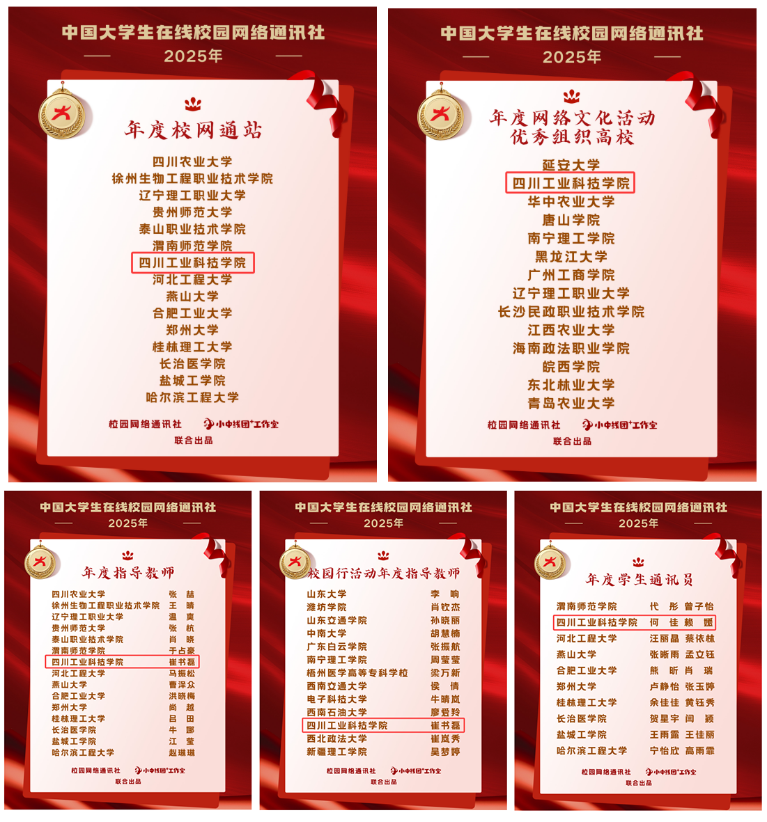 12月25日,教育部中国大学生在线公布2025年度表彰名单,学校荣获“年度校网通站”“年度网络文化活动优秀组织高校”,党委宣传部崔书磊老师荣获“校网通站年度指导教师”“校园行活动年度指导教师”,何佳、赖媛同学荣获“年度学生通讯员”称号。