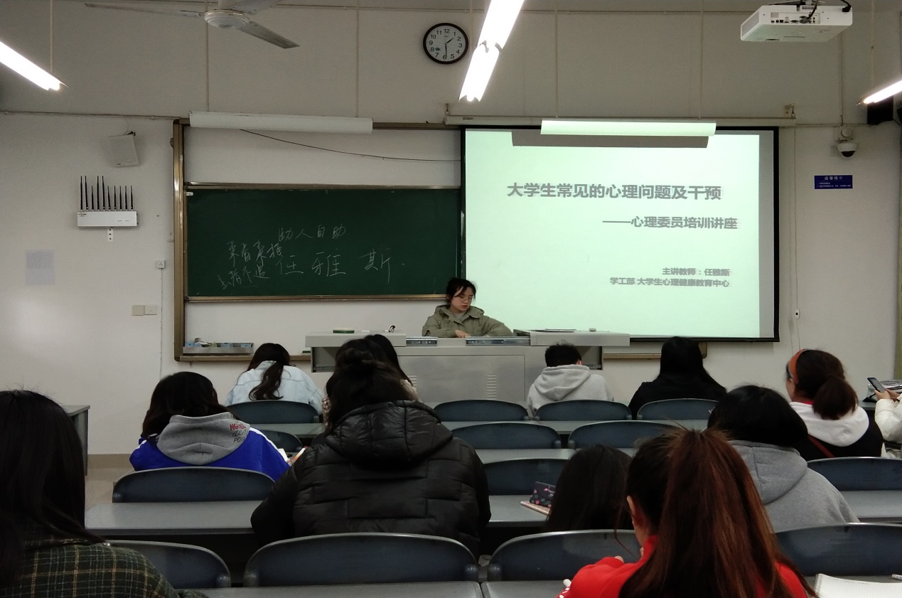 在讲座中,任雅斯老师详细介绍了大学生常见的心理问题及干预措施,概述了心理障碍——心理正常与异常的区分,并且列举了大学生常见的心理问题。随后为各班级心理委员讲述了她们在班级中的作用与优势、职责与任务;从“三个贴近”、“三个关注”、“三个抓好”告诉心理委员识别心理危机的方法与途径,最后提出心理委员应成为“五心”服务使者,强调了在工作中应遵守的一般原则和应使用的工作技巧。