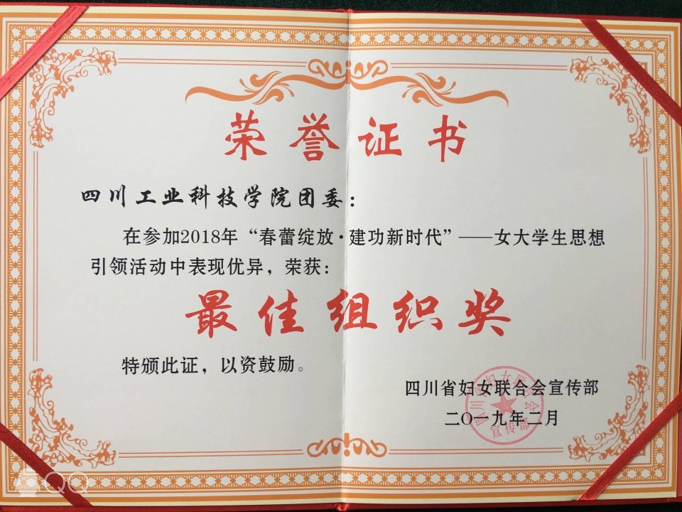 2019年2月,我校团委在参加2018年四川省妇女联合会举办的“春蕾绽放,建功新时代”————女大学生思想引领活动中表现优异,荣获最佳组织奖。