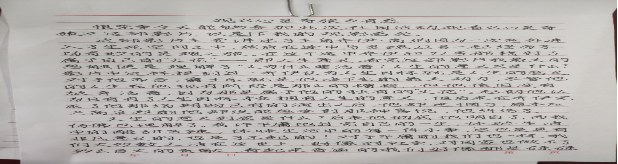 结合学生心理健康教育内容和广大学生观影喜好,在活动中播放了2020年由华特迪士尼公司和皮克斯动画工作室联合出品的奇幻动画电影《心灵奇旅》。该部影片不仅深受广大学子的喜爱与好评,而且呈现的毕加索立体主义想象画风,完美诠释了以美润心的教育实效。同时,在观影结束后,学校心理协会组织观影学生撰写了《心灵奇旅》观影感,促使学生将观影感悟融入日常生活,促建健康向上、积极进取的校园文化氛围。